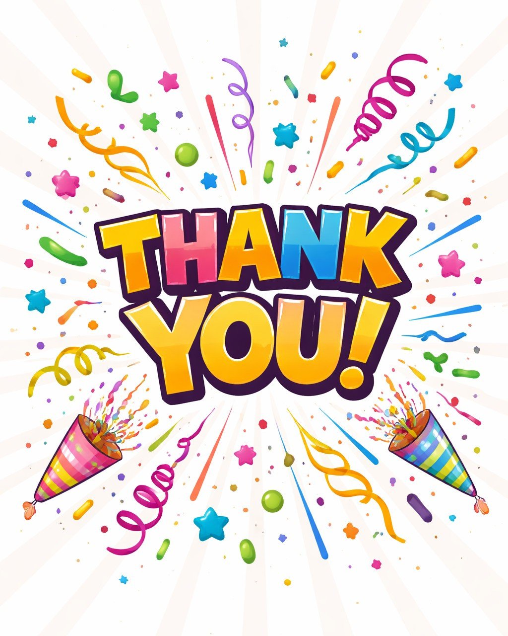 Bring instant celebration to your thank-you message with this cheerful confetti explosion design. Bright, balanced colours and bold typography create a joyful atmosphere that feels festive without overwhelming, making it ideal for colleagues, friends, teams, or happy group celebrations.