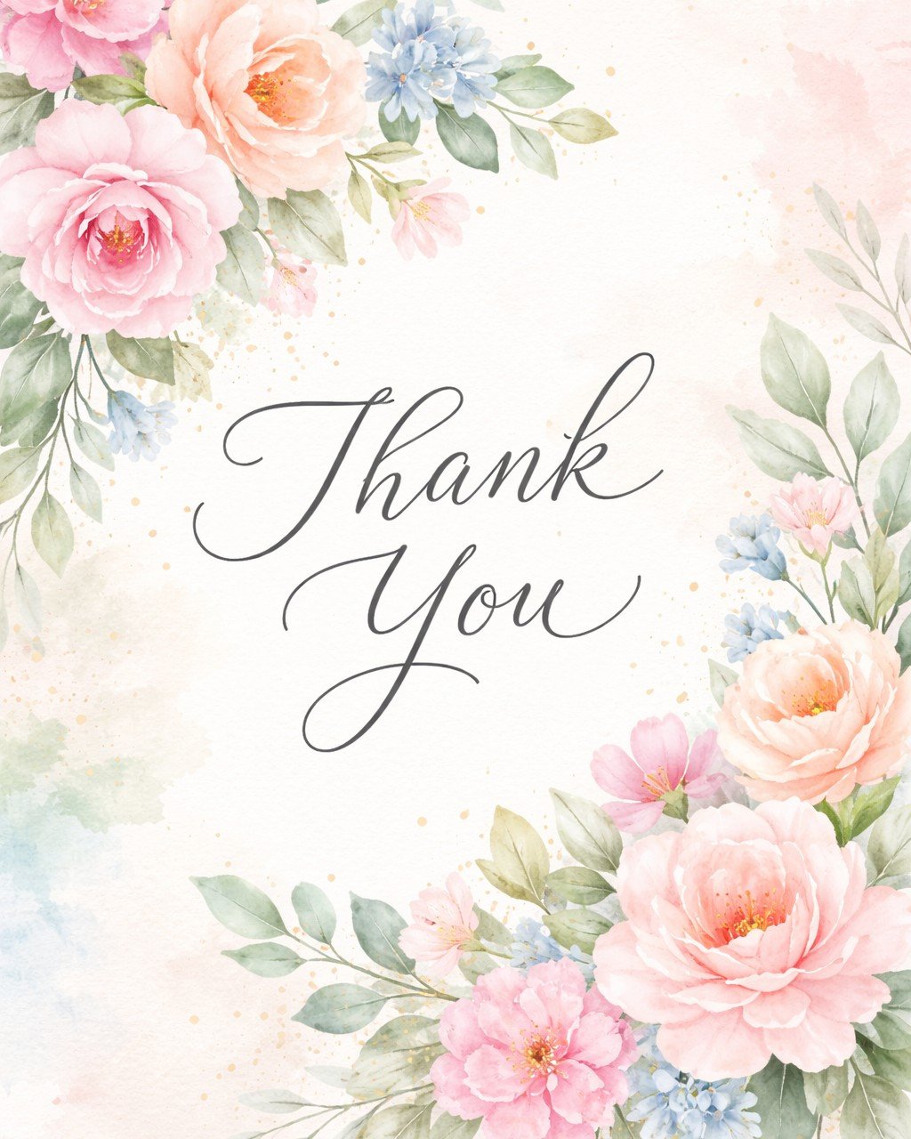 Share gratitude with gentle elegance through this soft watercolour floral design. Delicate pastel blooms and flowing script create a calm, heartfelt mood, perfect for thoughtful personal messages, warm appreciation, or sending a meaningful thank you with timeless, stationery-inspired charm.