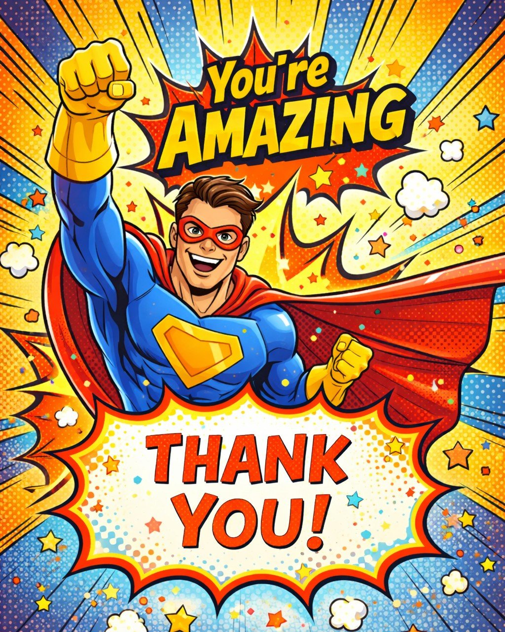 Send heroic appreciation with this energetic comic-style card featuring a bold superhero and vibrant burst effects. Playful colours and uplifting energy make it perfect for recognising someone amazing or celebrating achievements